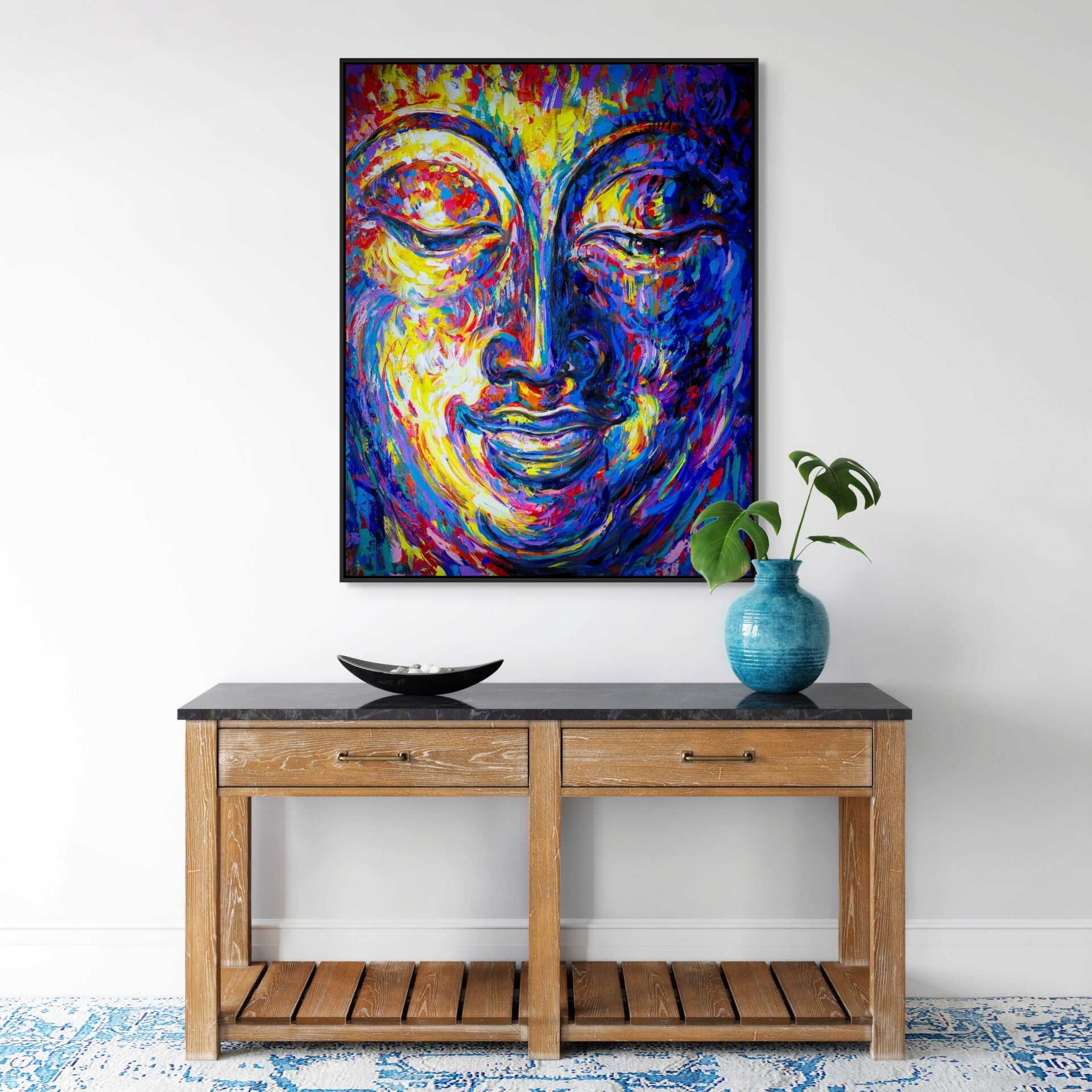 Vibrant energy and inner peace in one expressive Buddha portrait. Inner Joy combines powerful colors and dynamic brushstrokes into an artwork that radiates joy, balance and positive energy.